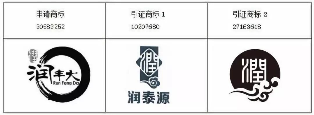 是以古代印章的形态呈现;汉字润丰大位于标识的中间部分,选用毛笔字进行呈现,字号较大,呈现出蚕头燕尾的艺术设计风格,给人一种浓郁灵动的古朴气息;拼音部分与汉字润丰大相呼应,具有特定的指向性。引证商标1是由图形和汉字构成的,图形部分是以一个黑色的长方形石碑为原型,在下方融入了云彩造型,在中间融入了菱形造型,且菱形的内部勾勒了繁杂的花纹;汉字部分润泰源采用黑体设计,字形方正。引证商标1整体给消费者以美观端庄之感。引证商标2是单纯图形商标,是以一个黑色的圆形底板为原型,在下面勾勒出云雾的造型,在中间勾勒出恢弘的建筑物的形态,整体如同在雾气缭绕的月亮上有着一座座美丽的宫殿的景象,给人以仙雾缭绕、琼楼玉宇、天上宫阙的视觉印象。申请商标以汉字润丰大为显著识别部分。引证商标1以汉字润泰源为显著识别部分。引证商标2为单纯图形商标,图形是标识的唯一元素,故,引证商标2以图形整体为显著识别部分,无固定呼叫。申请商标润丰大是申请人精心设计而成的,具有独特的设计渊源。一方面,润丰大取自申请人的关联公司青岛润丰大食品有限公司的企业商号,一方面体现了申请人及其合作伙伴团结一心,致力于为消费者提供口感顺滑、营养丰富、种类多样的滋补食品,满足广大消费者的需求;另一方面体现了申请人希望企业不断发展壮大,获得更多利润的愿景。引证商标1的含义为:美好生活的来源。引证商标2表达了注册人对美好事物的追求。申请人与引证商标1-2注册人的地域差距较大,相关消费者根本不能同时接触到不在同一地区的餐饮住宿行业,并且,就南北方的饮食文化来说,其差异也较大,申请人与引证商标1-2注册人提供的具体服务也会明显不同。可见,申请商标与引证商标1-2在实际推广中根本不会有交集的可能性,其形成的市场格局也截然不同,在实际使用过程中完全不会造成相关消费者的混淆与误认。由于我公司律师分析的有理有据,商评委最终裁定30583252号润丰大润商标予以初步审定。