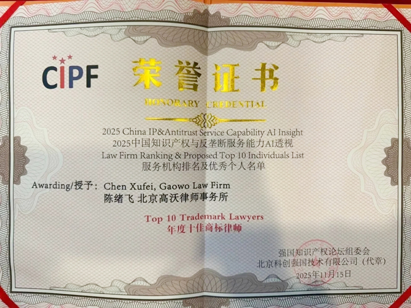 Chen Xufei was awarded the "Top 10 Trademark Lawyers"